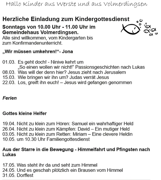 Erst vor Kurzem habe ich meinen Basiskurs auf Gut Bustedt absolviert. Dort habe ich das Grundwissen über interessante Unterrichtsgestaltung gelernt und möchte nun dieses Wissen nutzen, um anderen Kindern und Jugendlichen eine tolle Zeit hier in der evangelischen Kirchengemeinde Volmerdingsen-Werste zu ermöglichen. Ich würde mich freuen, viele Kinder und Jugendliche hier im Kindergottesdienst zu sehen!
