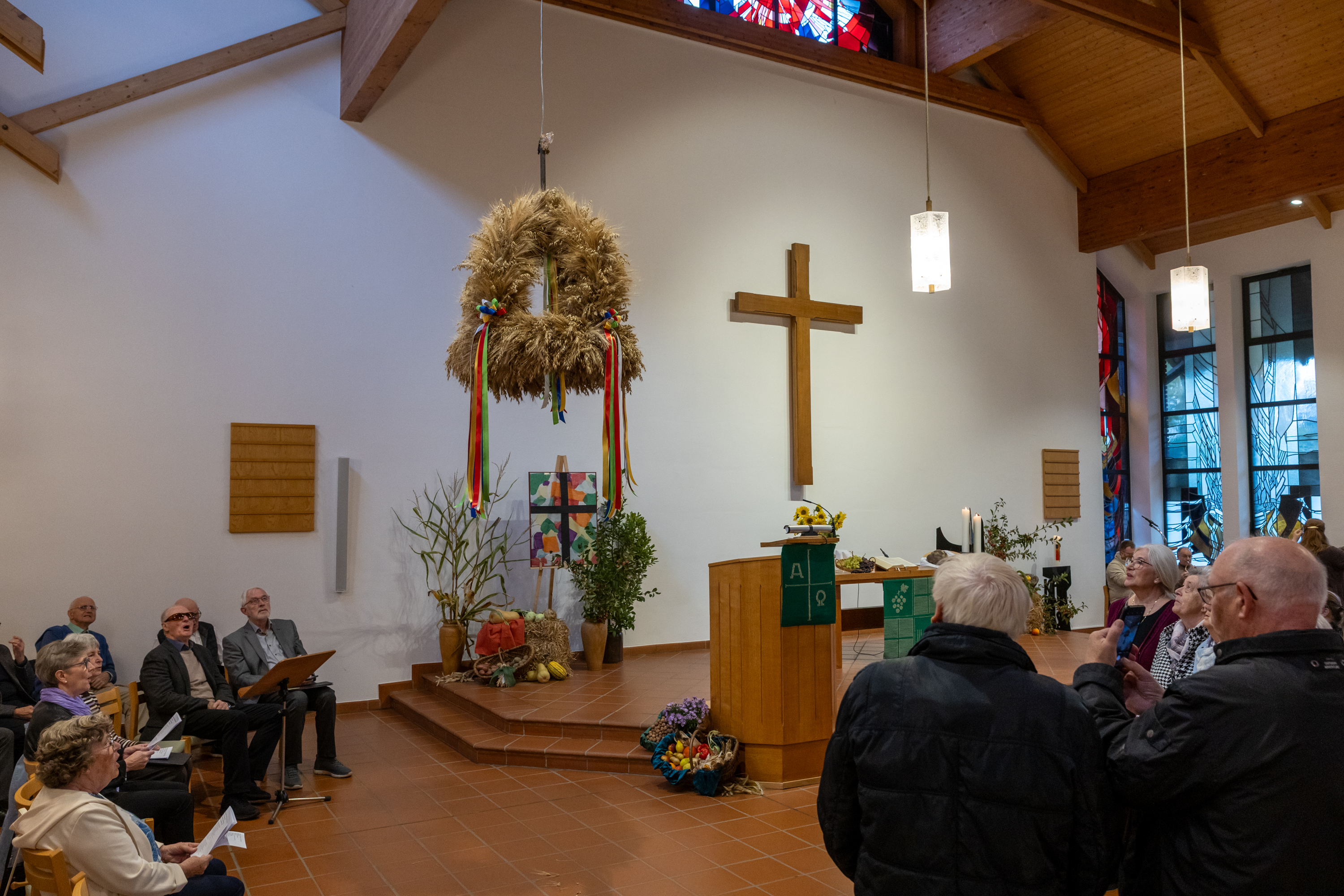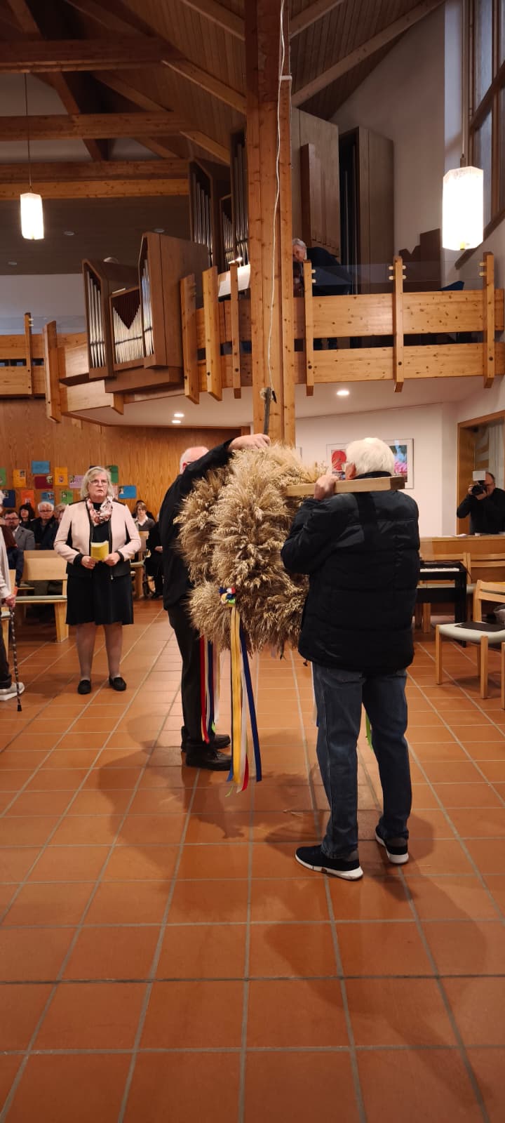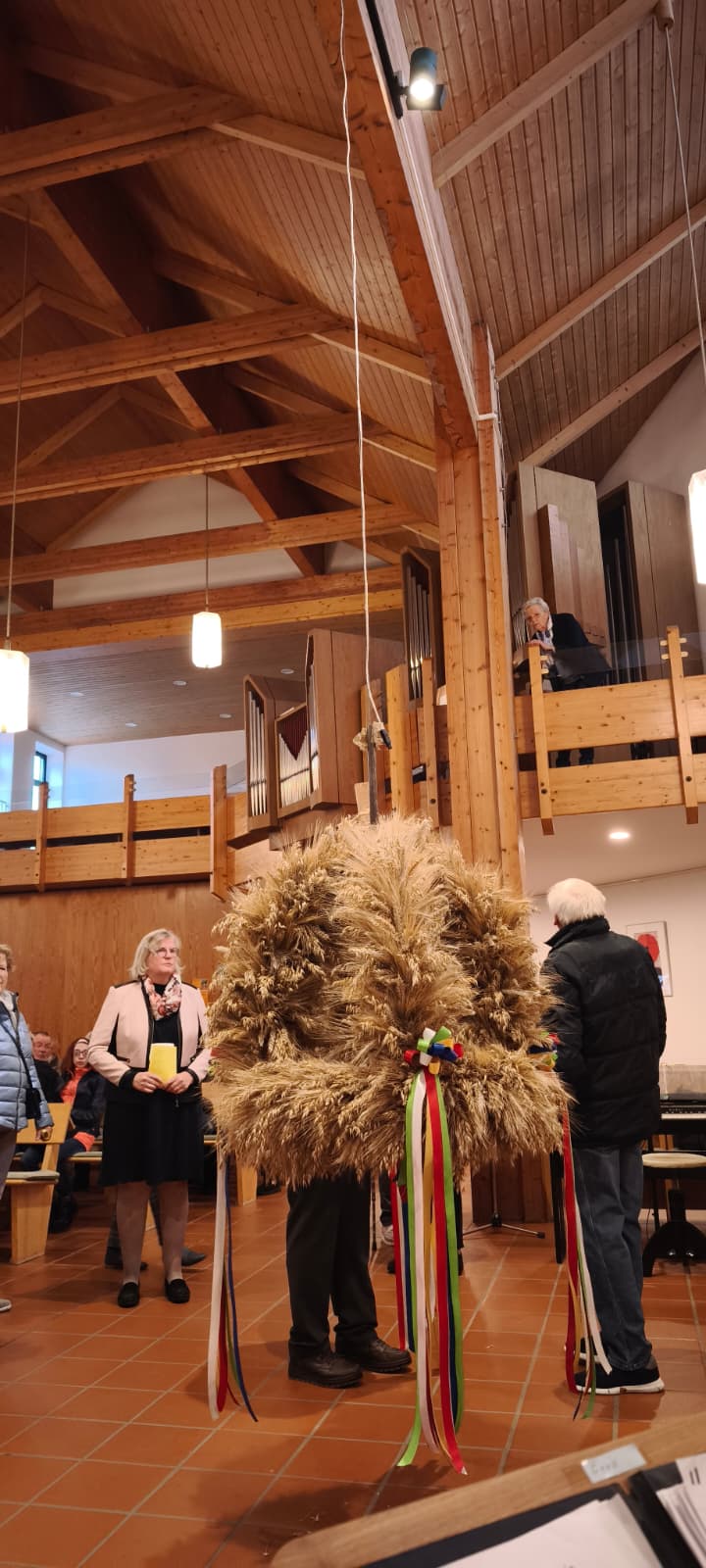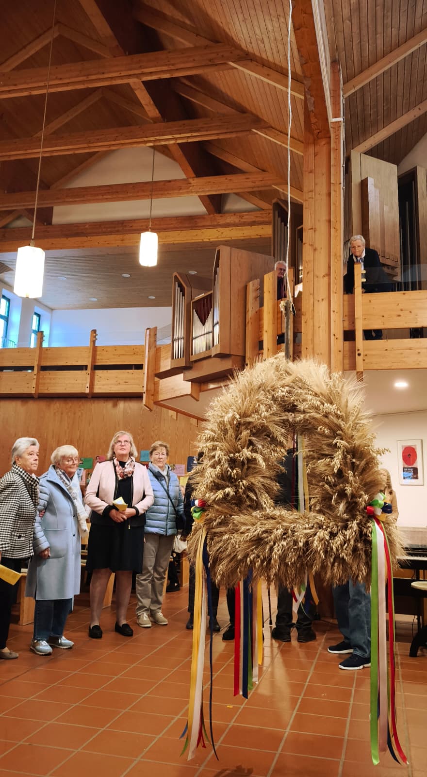 Glücklich und zufrieden, und vielleicht auch ein bisschen müde versammelten wir uns dann zum Erinnerungsfoto um unser „Prachtstück“! Wir freuten uns auf das Erntedankfest – zum Beginn des Gottesdienstes würden wir gemeinsam die fertig geschmückte Krone feierlich in die Kirche bringen und aufhängen, so war es geplant.