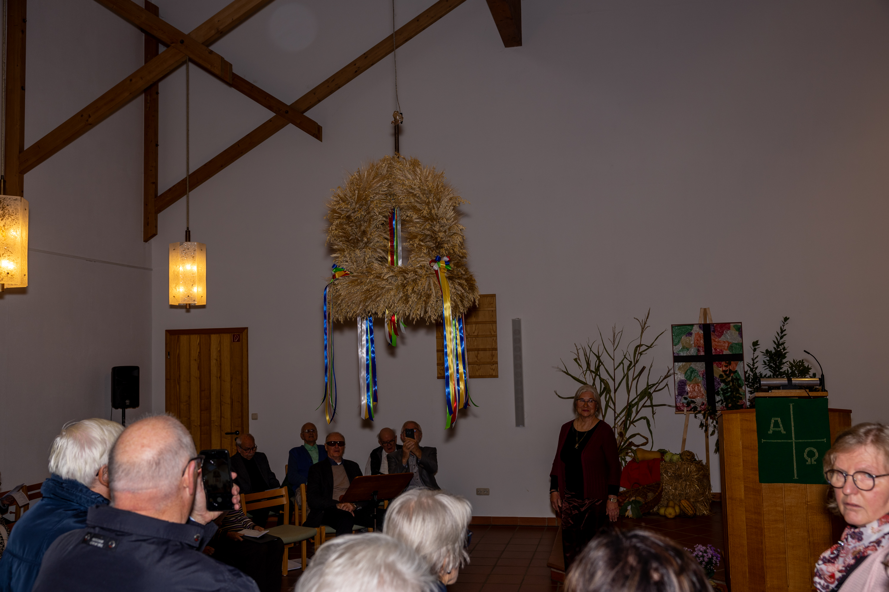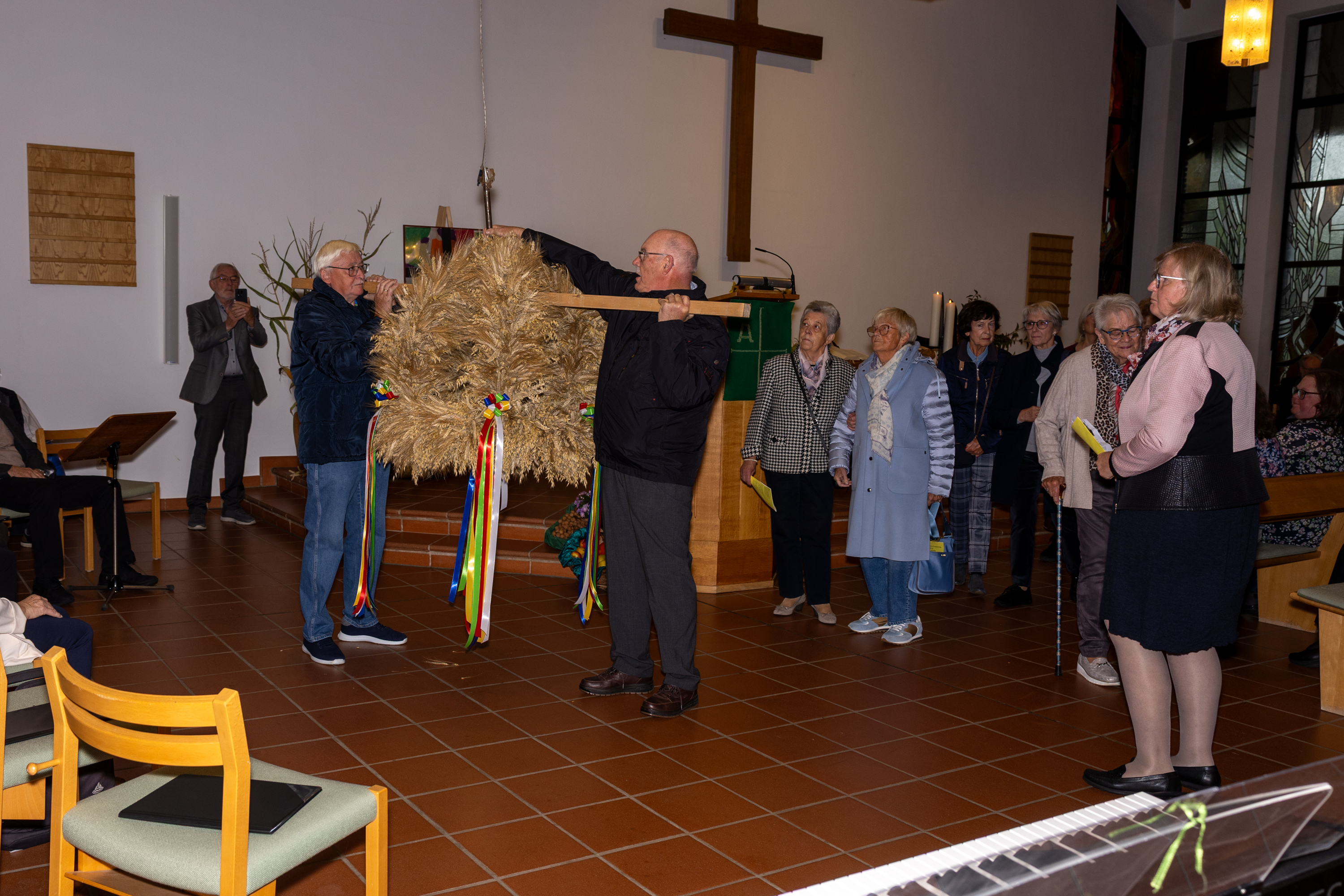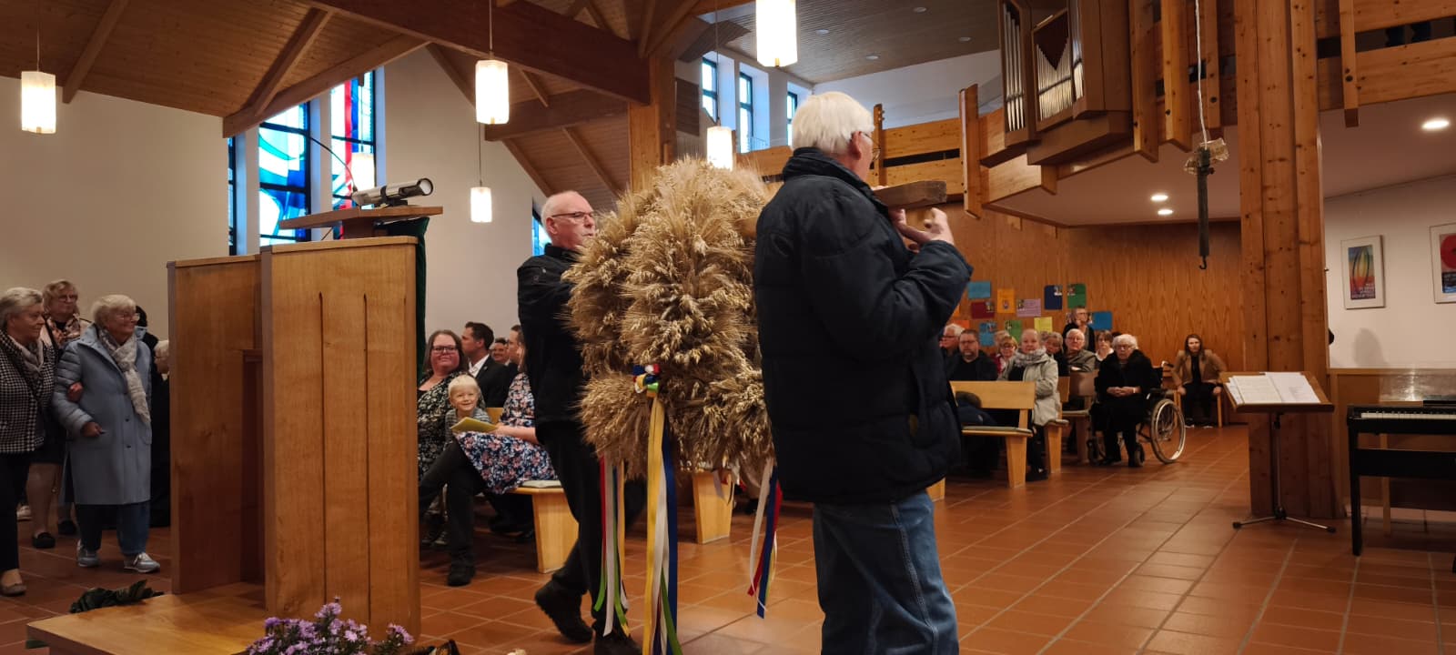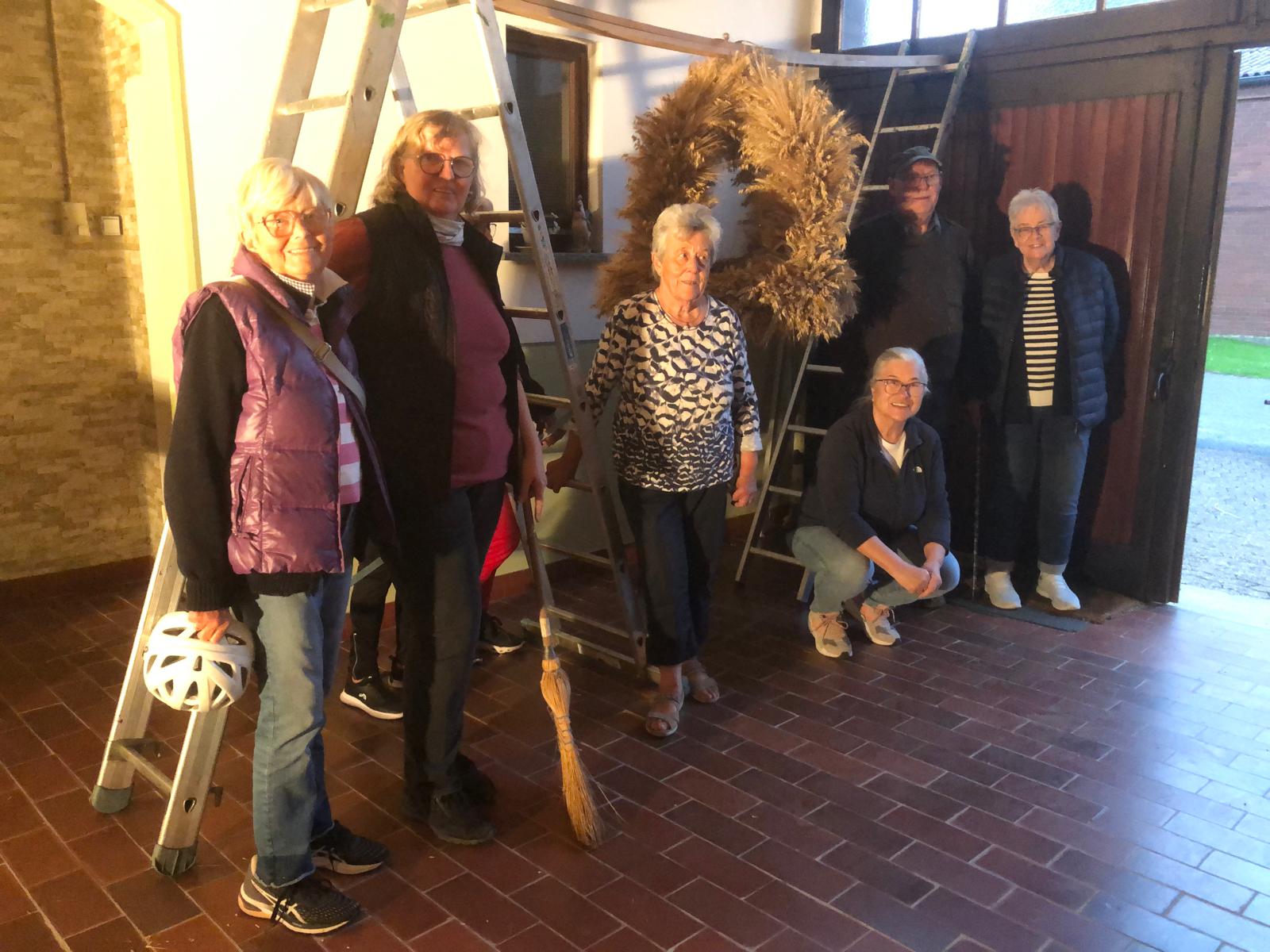 Wer am Mittwoch, dem 17. September nachmittags zufällig am Hof von Familie Südmeyer vorbeikam, konnte auf der großen Deele ein reges Schaffen beobachten. Dort wurde von einigen Landfrauen, ehemaligen Presbyterinnen und Freundinnen eine neue Erntekrone für die Werster Kirche gebunden. Neun Frauen waren am Start, und Ilse hatte noch ihren Mann mitgebracht. Friedrich war schnell unser „Chef“, denn er wusste, wie die große Krone gebunden werden musste.