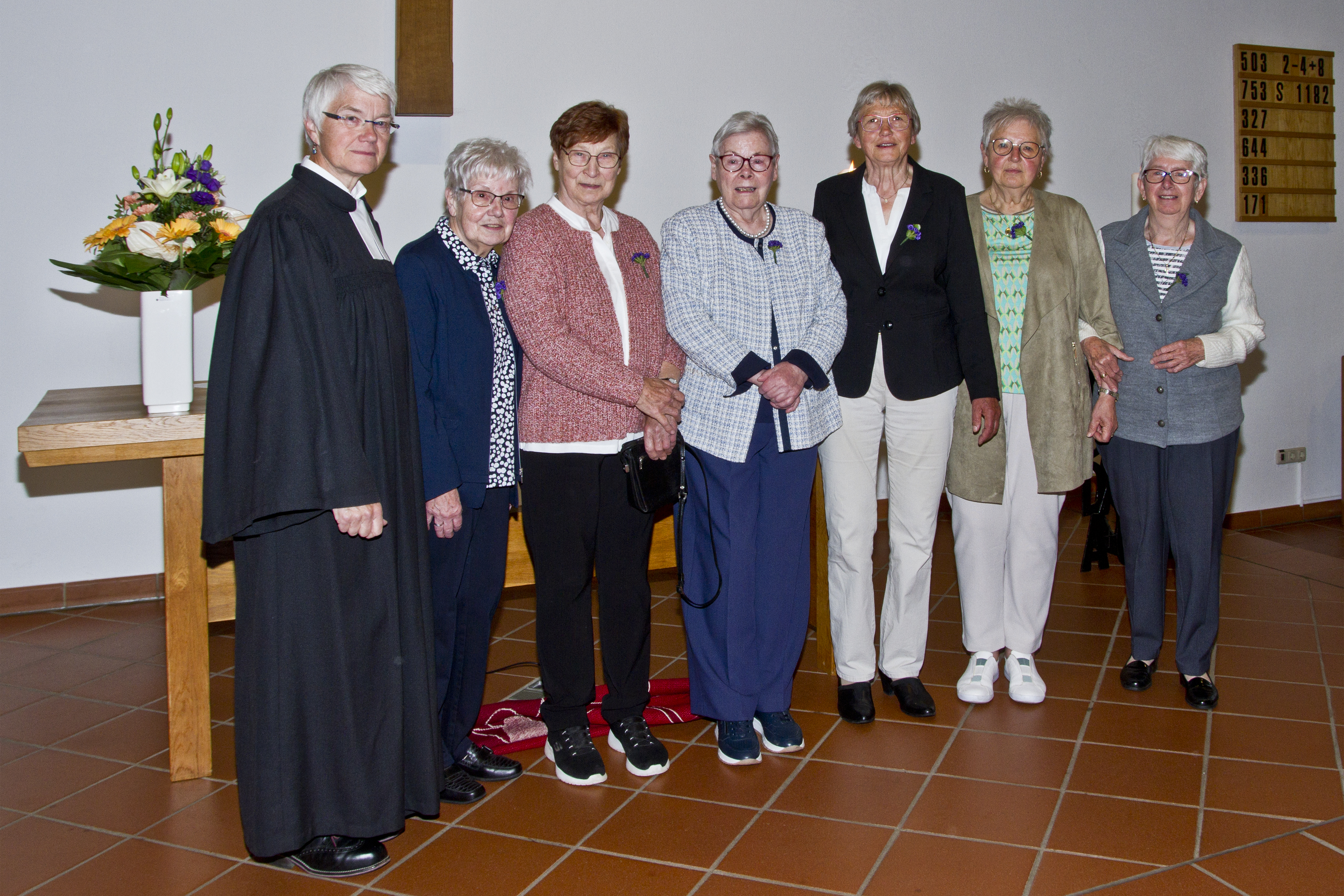 von li.: Pfarrerin Neddermeyer; Bärbel Wilmsmeier, geb. Poneleit; Irma Wallenstein, geb. Bekemeier; Lydia Beck, geb. Backs; Rite van der Velde, geb. Althoff; Sigrid Nolting, geb. Jakobi; Renate Lange, geb. Zegarek
